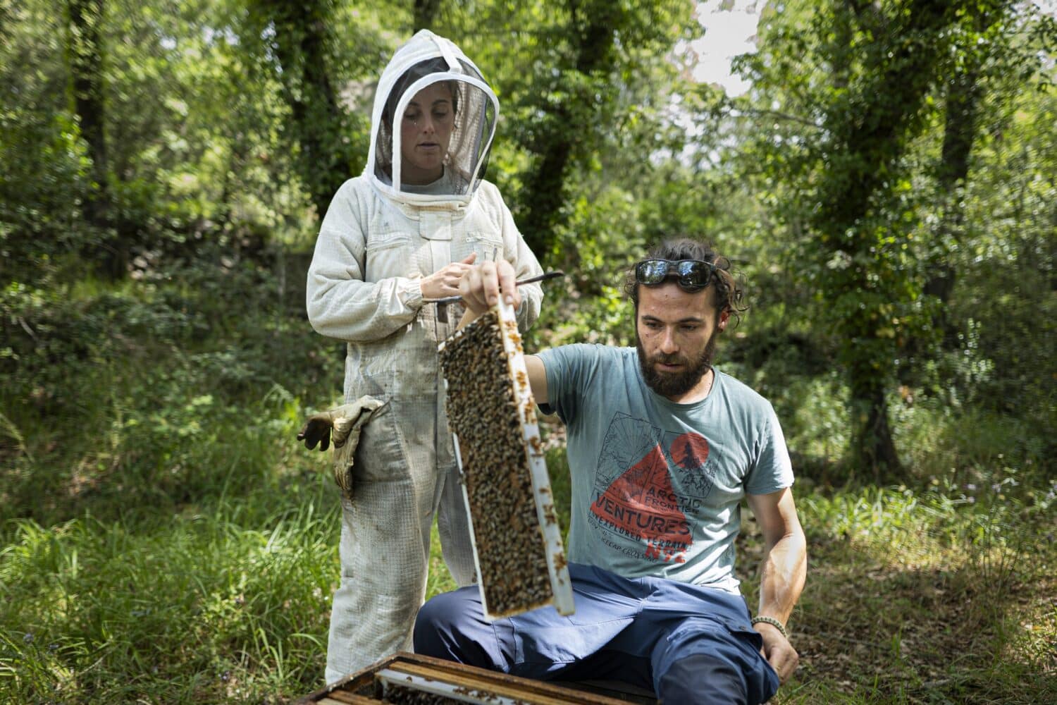 C’est en Provence, dans le Haut-Var, à Méounes-les-Montrieux, que Lucille Guillermain et Jordan Maury, un couple de trentenaires, ont fondé Les Ruchers du Pont Vieux en 2019. Leur petite maison de pierres entourée de champs de lavande, est nichée au pied d’une colline recouverte de chênes. Juste à côté, un grand bâtiment est en construction : leur future miellerie. Ici, l’élevage est extensif, les abeilles sont nourries avec leur propre miel et soignées de façon  naturelle. Lucille et Jordan ont fait le choix d’une apiculture biologique et respectueuse du cycle naturel des abeilles.  Autre particularité : la transhumance. Le couple déplace les ruches au fil des saisons, parfois à plusieurs heures de route, pour suivre les floraisons, la qualité et la diversité des fleurs pour offrir aux abeilles une alimentation variée et naturelle.